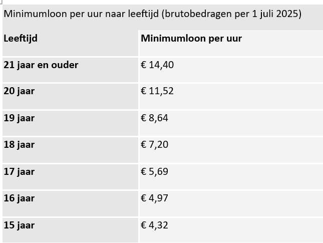 Per 1 juli 2025 wordt het minimumuurloon € 14,40. De bedragen die vanaf die datum van toepassing zijn staan in bijgaande tabel.